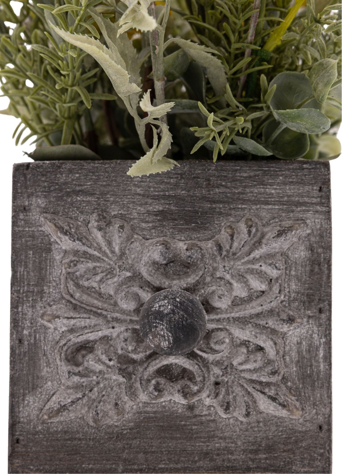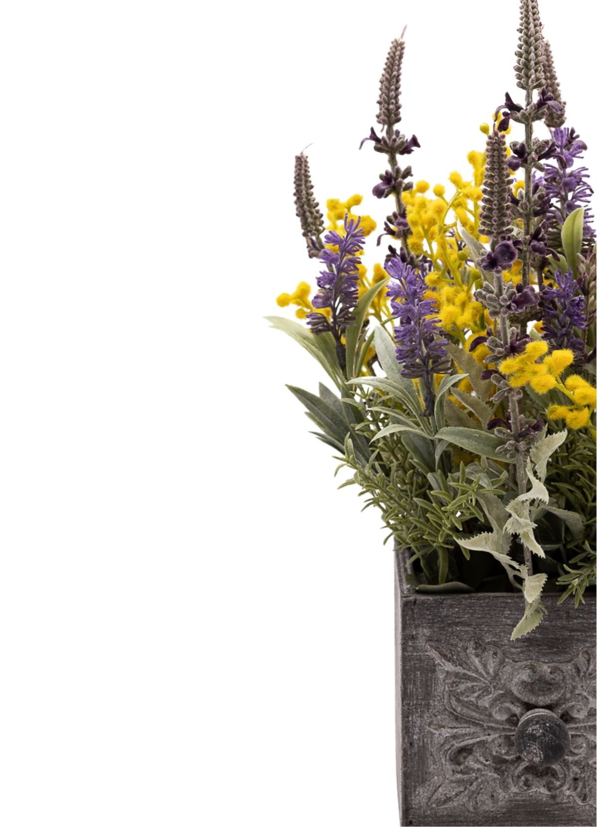 La lavanda en diferentes variedades se convierte en la gran protagonista de esta composición, aportando un aire fresco, delicado y muy característico que evoca campos naturales en flor. La mimosa introduce un punto de luz suave que equilibra el conjunto con un matiz más cálido y ligero. El eucalipto y el romero completan la composición aportando estructura, textura y un toque verde muy natural que refuerza su estilo aromático y sereno. Montado sobre una base de madera envejecida cuadrada con labrado decorativo en el frontal, este centro destaca por su estética rústica y elegante, ideal para aportar calma y un toque natural a cualquier espacio.