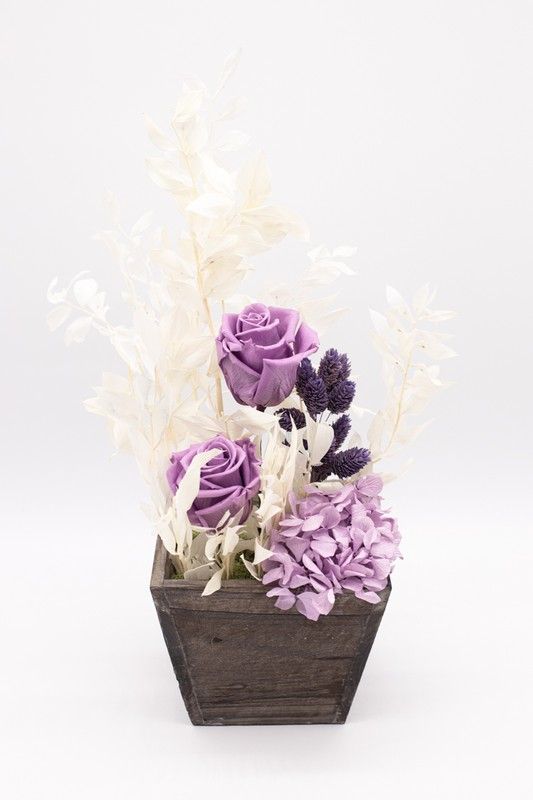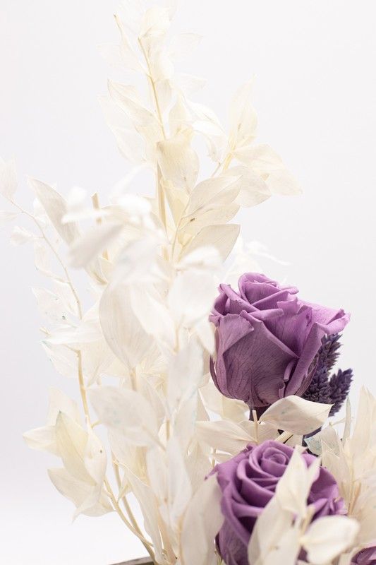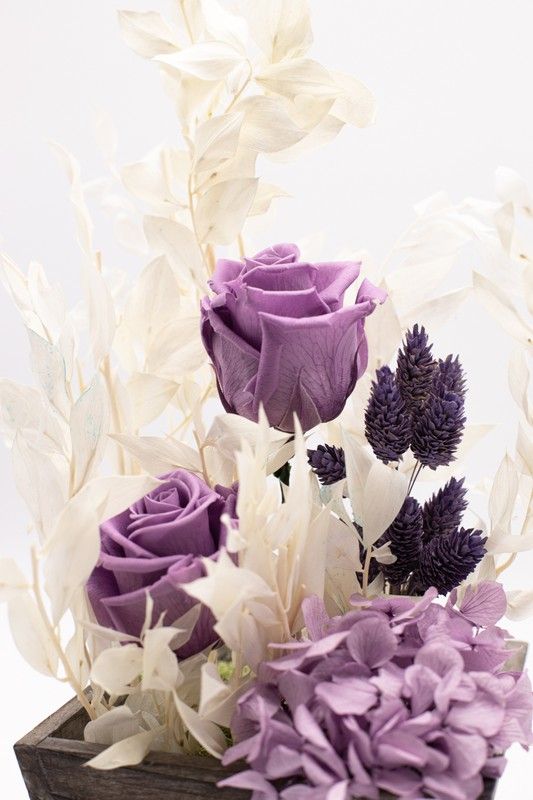 Centro de flores secas y preservadas con rosas liofilizadas en olor lila. También lleva hortensia de color lila