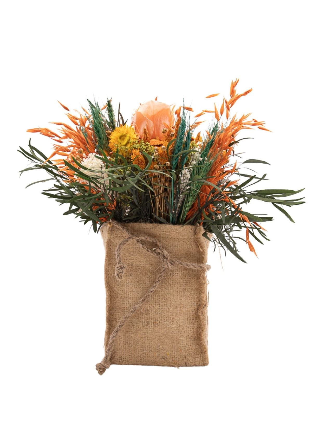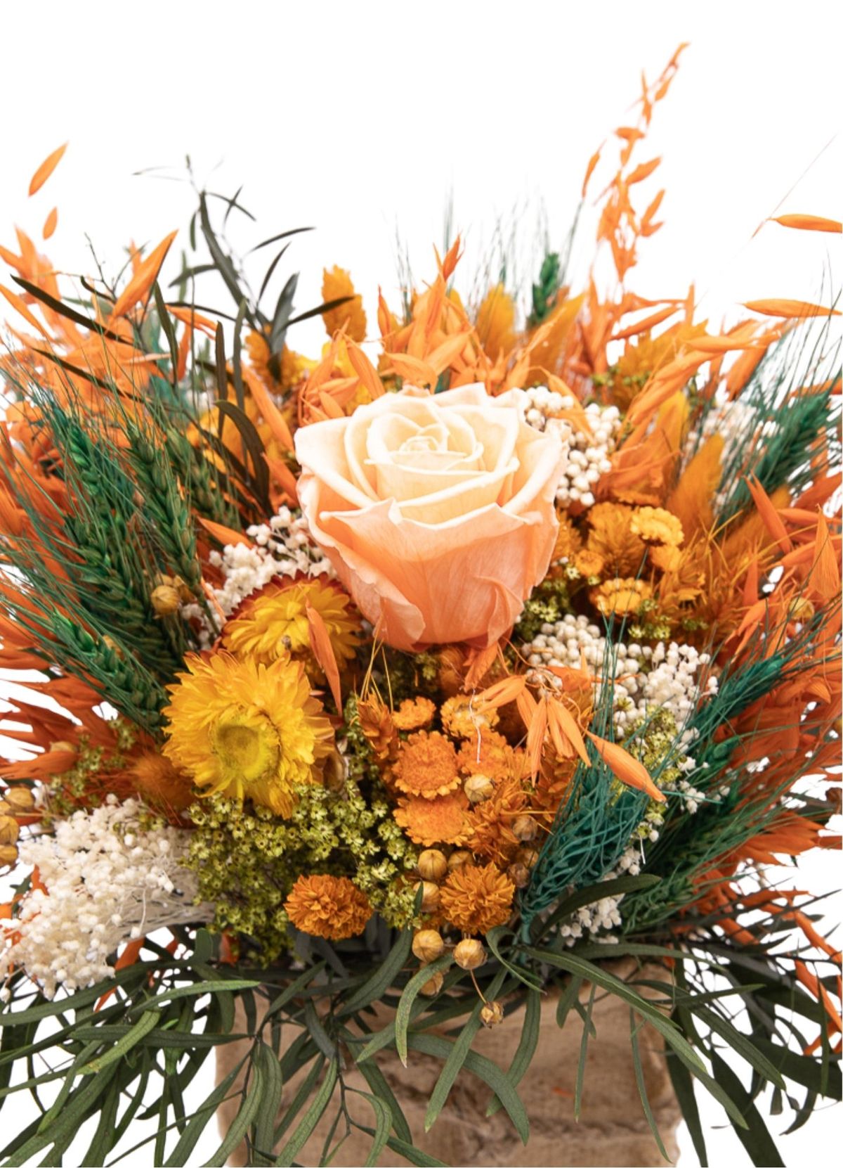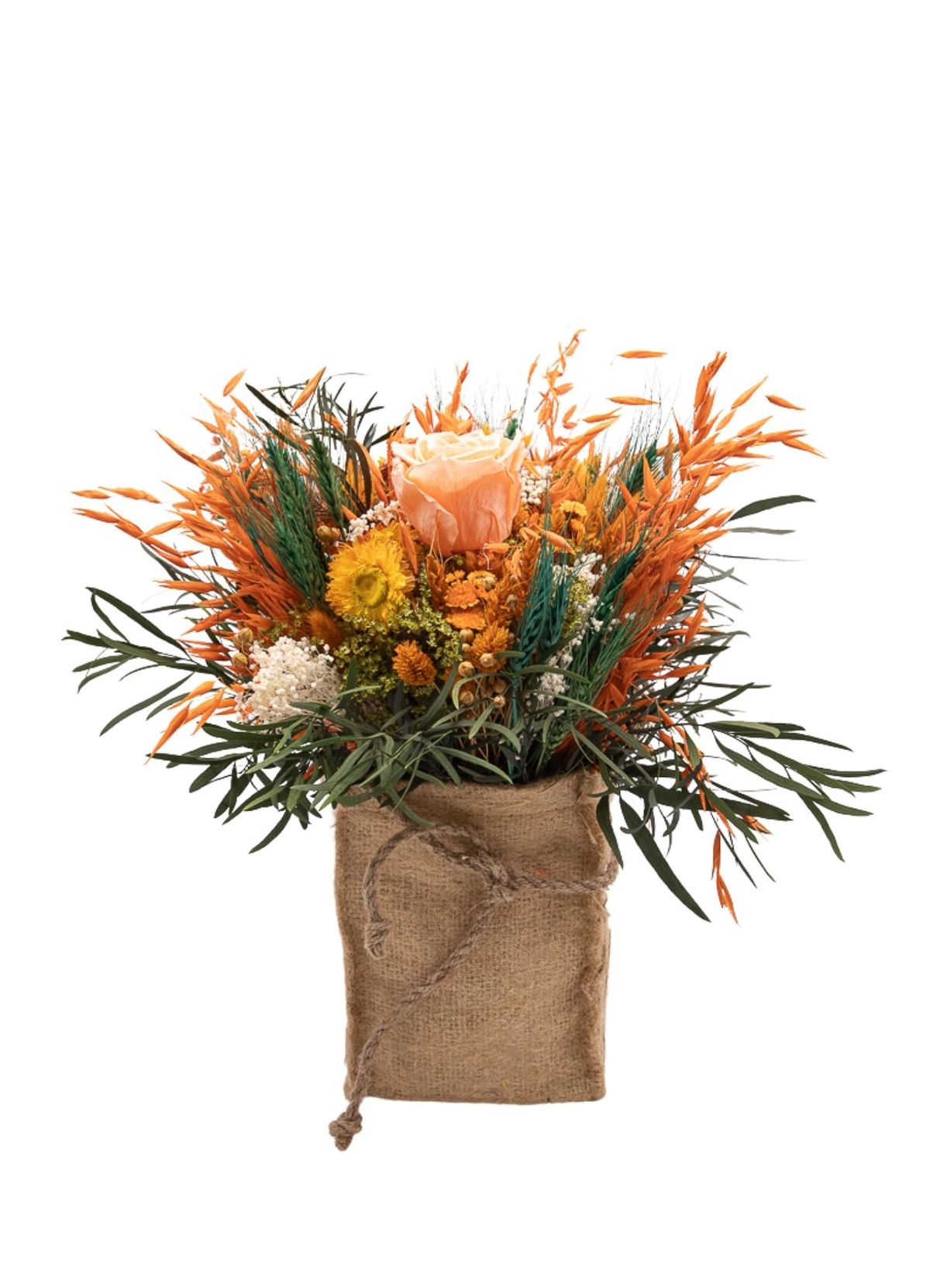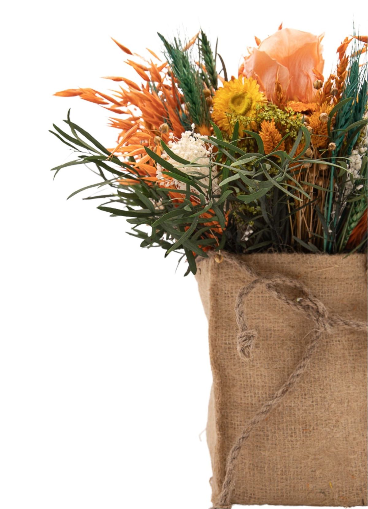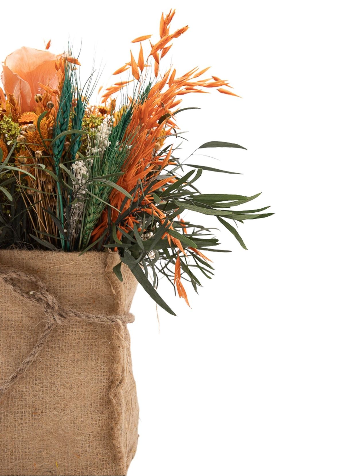 Una composición llena de luz y calidez donde los tonos naranjas se combinan con verdes suaves y matices naturales, creando un arreglo equilibrado y con mucha personalidad. La rosa preservada en color salmón se convierte en el punto focal, aportando un toque romántico y elegante que destaca en el conjunto. La avena, el lagurus y el phalaris en tonos naranjas aportan textura y movimiento, mientras las espigas verdes y la hoja de bamboo introducen frescura y contraste. El broom blanco, el lino natural, la flor de arroz y el xerochrysum amarillo suavizan la composición, aportando luz y armonía. La base de tela de saco con cuerda decorativa refuerza su estilo rústico y acogedor, convirtiéndolo en una pieza perfecta para decorar con un aire natural, cálido y atemporal.