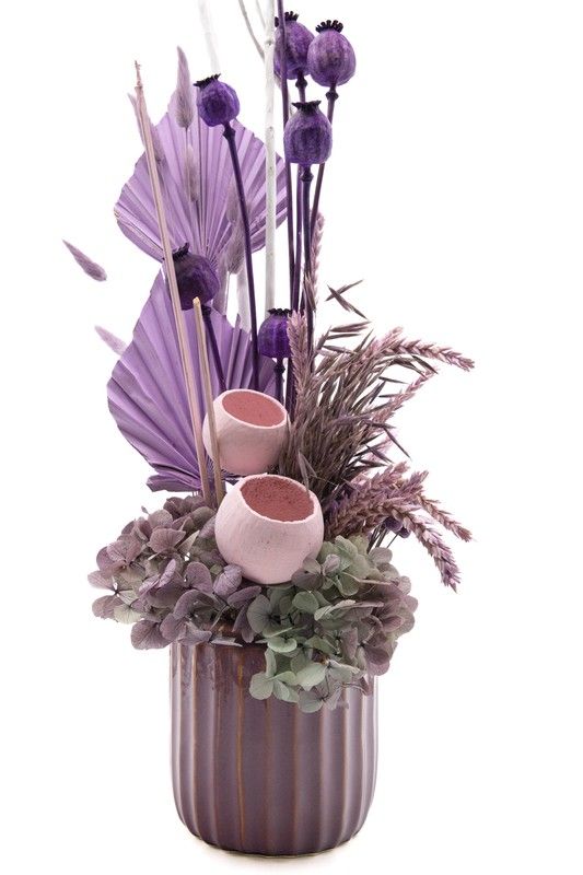Las medidas son aproximadas y pueden sufrir alguna ligera modificación ya que todos los diseño se elaboran de forma artesanal por nuestro equipo de floristas. Los colores pueden ser algo distintos porque son materiales naturales que han pasado por un proceso de preservación y secado. Las flores secas y flores preservadas que usamos en todas nuestras colecciones son un producto 100% natural tratadas para que duren eternamente y prácticamente libre de mantenimiento. No solo son ecológicas, sino que gracias a su excelente relación calidad precio suponen un gran ahorro para tu bolsillo. Además, puedes elegir multitud de variedades por ello podemos crear diferentes composiciones de diseño floral entre una extensa y detallada selección de flores.El único requisito para que mantengan toda su belleza es evitar colocarlas a lado de fuentes de luz directa para que no se decoloren y retirarles el polvo de vez en cuando, con la ayuda de una gamuza o de un secador usando aire frío, con cuidado de no dañar sus delicados pétalos. Con estos sencillos consejos podrás mantener tus flores secas y flores preservadas en adecuadas condiciones durante mucho tiempo:No las introduzcas en recipientes con agua. Recuerda que son flores tratadas que no estén vivas aunque tengan esa apariencia. Debe mantenerse alejada de lugares o ambientes húmedos. En zonas costeras o lluviosas en las que la humedad es muy intensa, debemos colocarlas en espacios alejados de puntos de entrada de aire o ventilación. No las coloques en lugares en los que da el sol de forma directa. Las flores preservadas deben mantenerse alejadas de la exposicón solar prolongada y continuada. No se deben presionar, doblar o aplastar las diferentes los pétalos o tallos. Son piezas delicadas que pueden dañarse con facilidad. La preservación permite conseguir todo tipo de decoración de interiores con alto valor ornamental. No olvides que son flores naturales que han sido sometidas a un proceso de conservación para que mantengan su belleza sin marchitarse y sin necesidad de cuidados. Ecogicas, económicas, bellas, duraderas, versátiles!! nuestros diseños de flor seca y flor preservadas son perfectos para decorar y regalar.