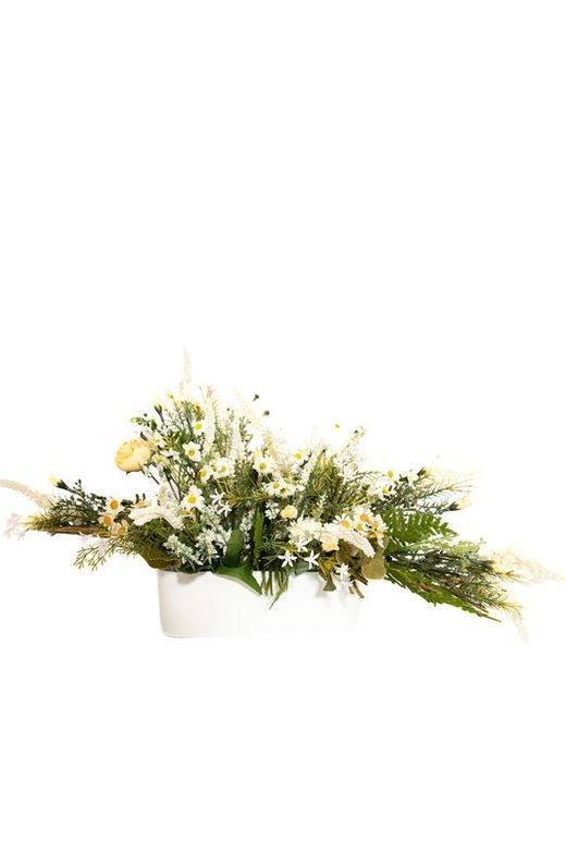 Natural y silvestre centro de flores para cementerio. Margaritas y lavanda artificial son las flores principales de este centro.