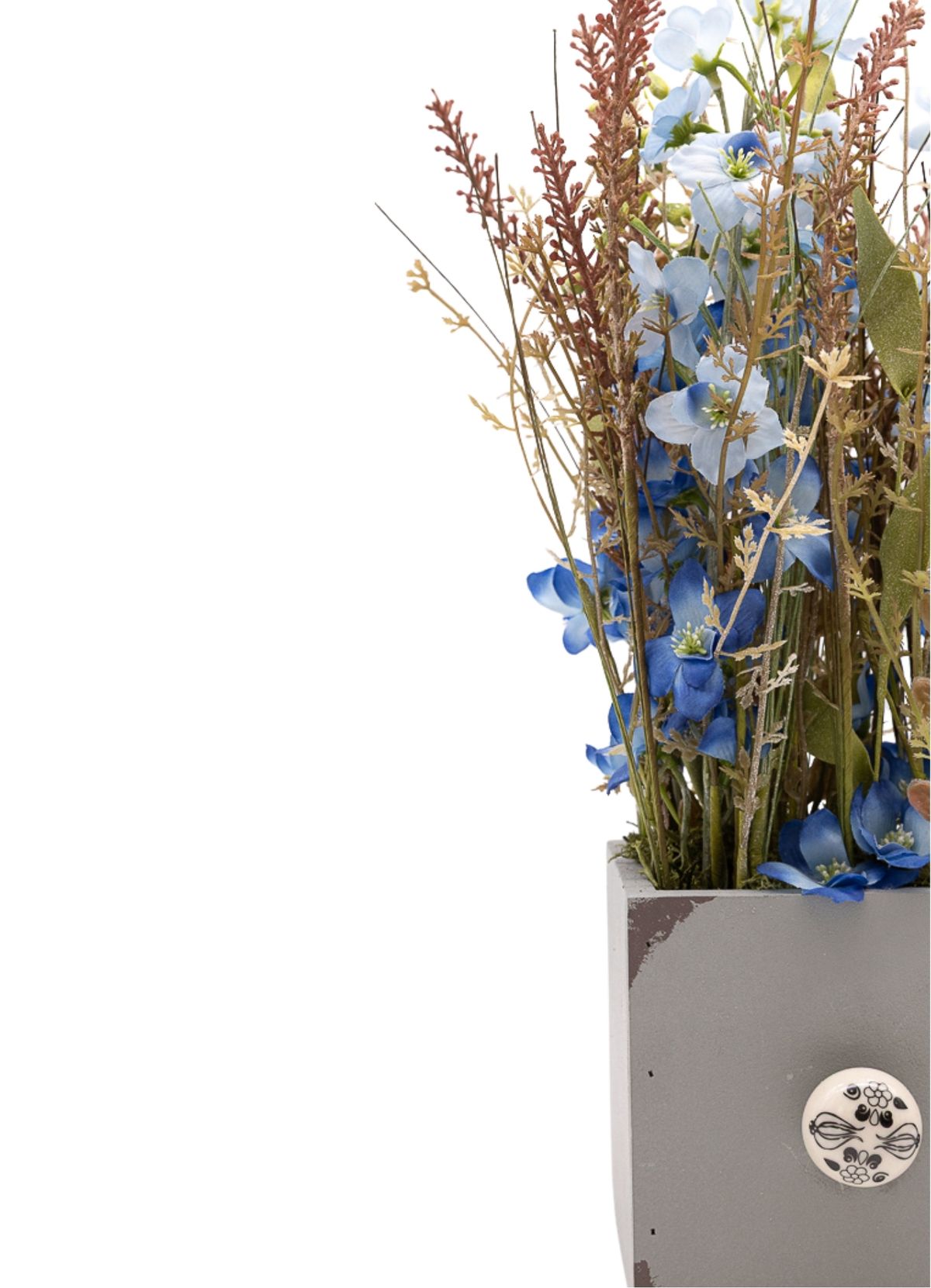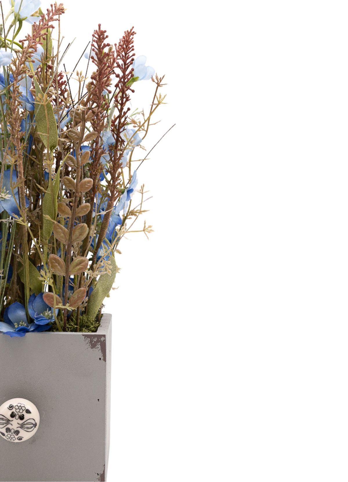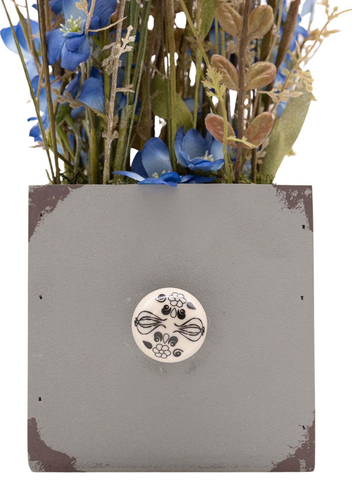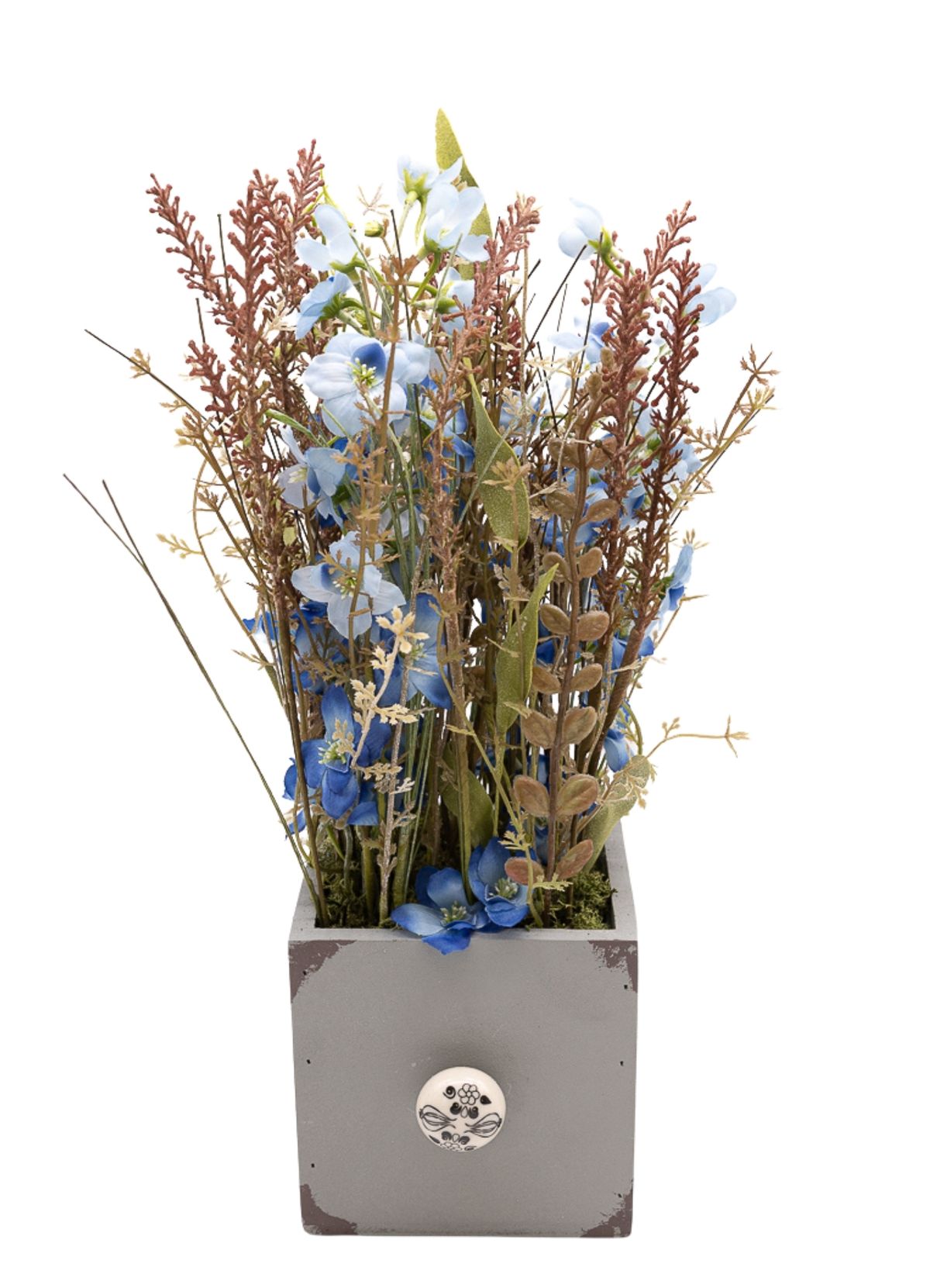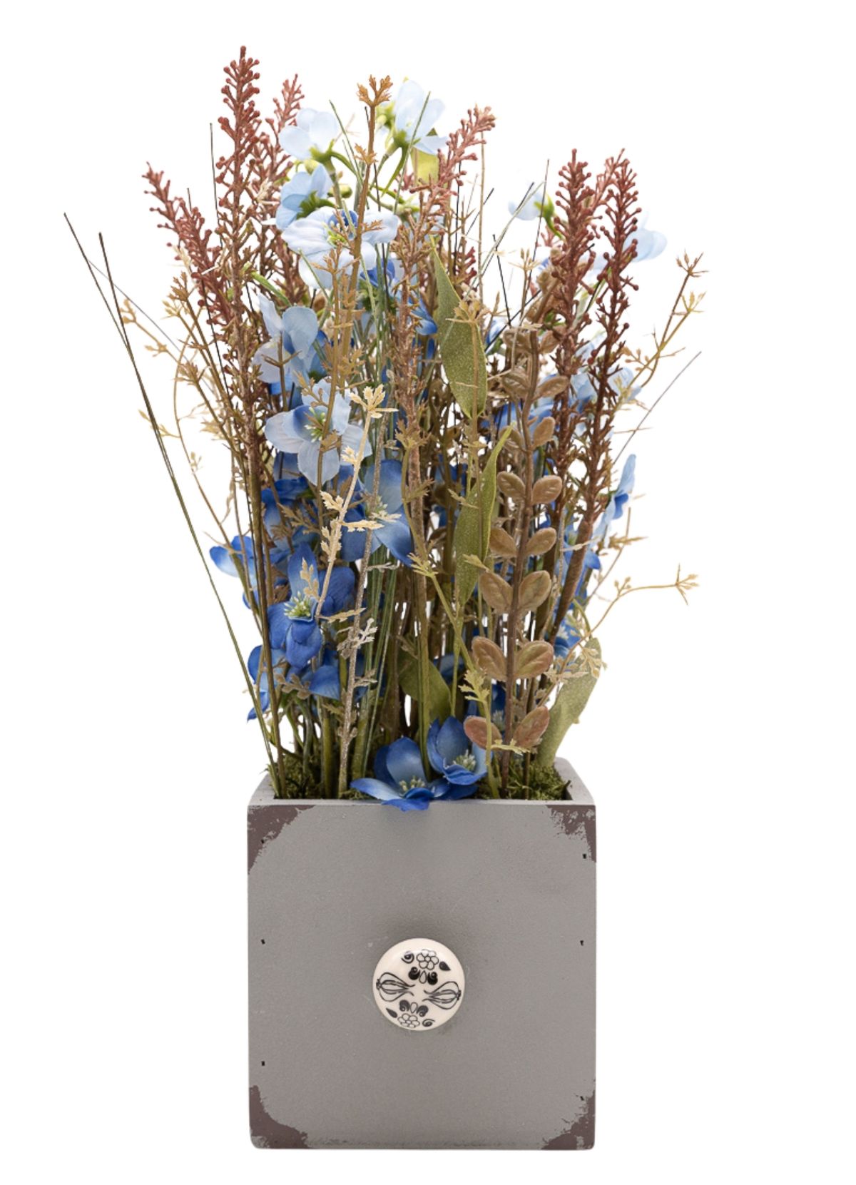 Una composición serena y equilibrada donde las pequeñas flores azules aportan un toque sutil de color, creando un efecto visual suave y relajante. Los verdes variados acompañan el conjunto, añadiendo volumen y naturalidad a la pieza. El montaje en paralelo refuerza su estética ordenada y elegante, dando como resultado un diseño limpio y armonioso. Presentado sobre una base cuadrada de madera en color gris con un pomo decorativo efecto piedra, este centro es ideal para quienes buscan una pieza discreta pero con estilo, perfecta para aportar calma y frescura al ambiente.