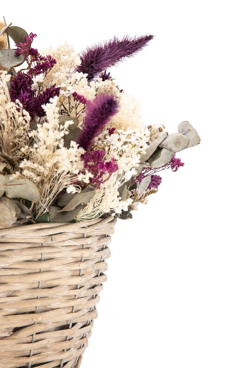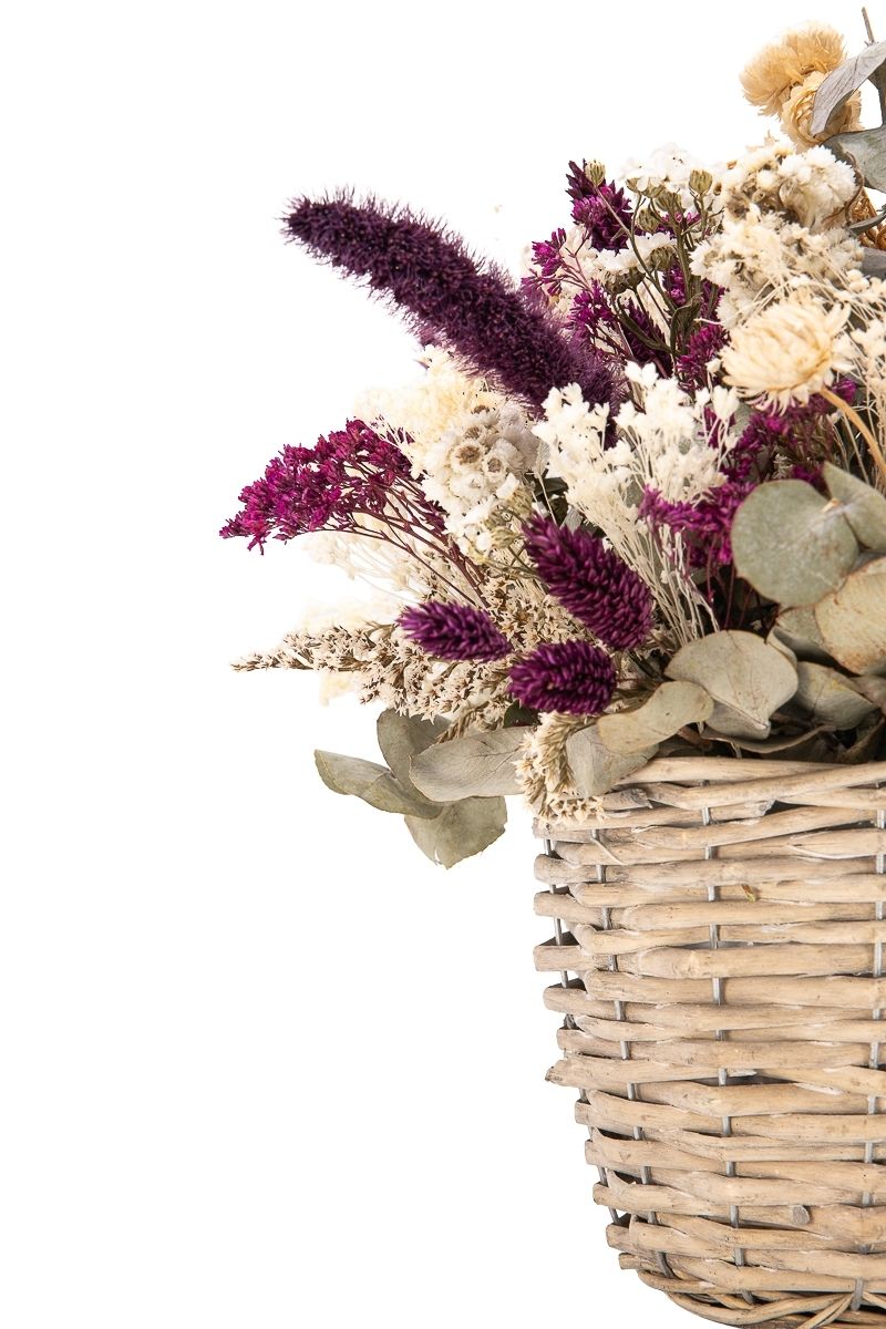 Los matices lilas se entrelazan con blancos suaves para crear una composición ligera y elegante, perfecta para aportar serenidad y frescura a cualquier espacio. La setária y el phalaris en tonos lila aportan movimiento y textura, mientras el limonium, el broom y las pequeñas margaritas equilibran el conjunto con puntos de luz naturales. Las perlas nacaradas y el helichrysum añaden un detalle sutil y delicado que eleva la pieza, mientras el eucalipto aporta un acabado fresco y armonioso. Todo ello presentado en una base de mimbre que refuerza su carácter natural y acogedor, ideal para decorar con estilo y sin preocupaciones de mantenimiento.