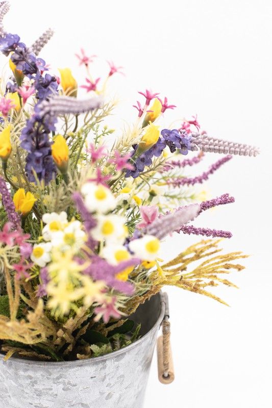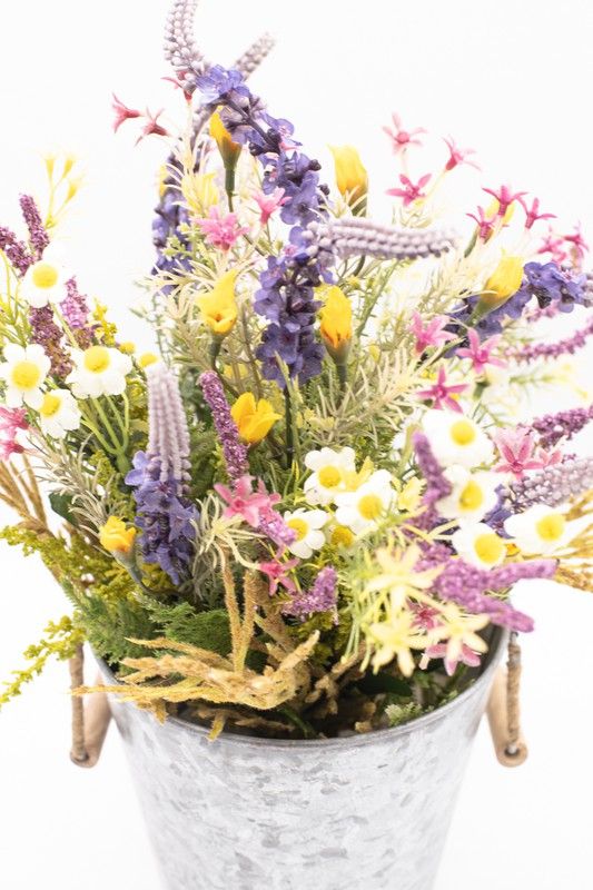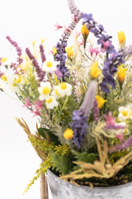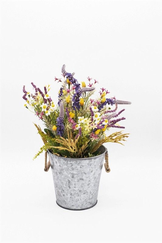 Flores silvestres en color lila en macetero de metal