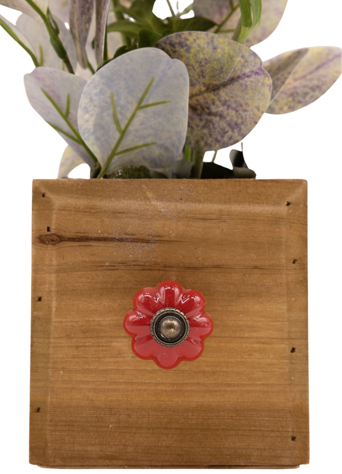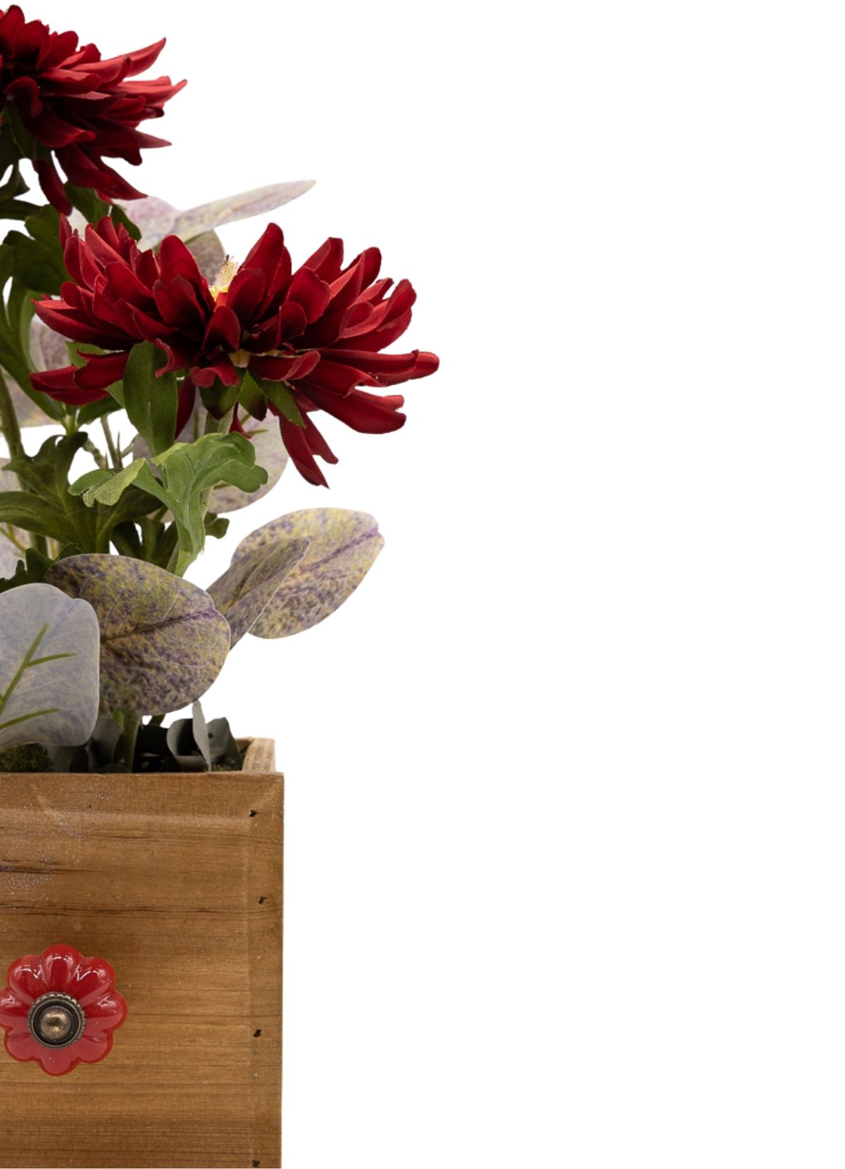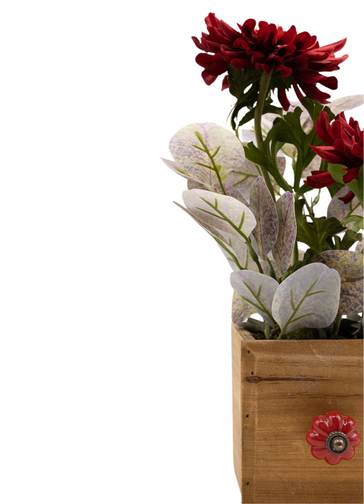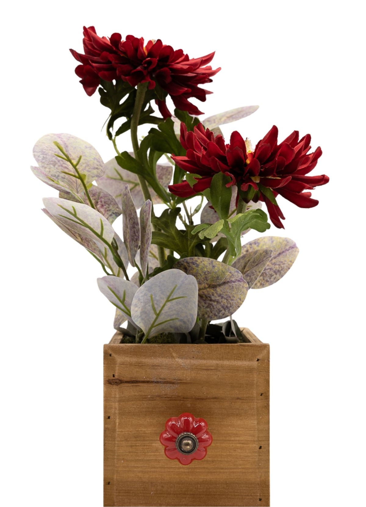 La fuerza del color rojo oscuro intenso define esta composición de líneas sencillas pero con gran impacto visual. Las dos gerberas se convierten en las protagonistas absolutas, aportando carácter, elegancia y un punto dramático que no pasa desapercibido. El eucalipto acompaña el conjunto aportando frescura y equilibrio, suavizando la intensidad del rojo con un contraste natural que armoniza la pieza. Montado sobre una base de madera natural cuadrada con pomo decorativo en color rojo, este centro destaca por su estilo sobrio y elegante, ideal para aportar un toque de fuerza y personalidad a cualquier espacio.