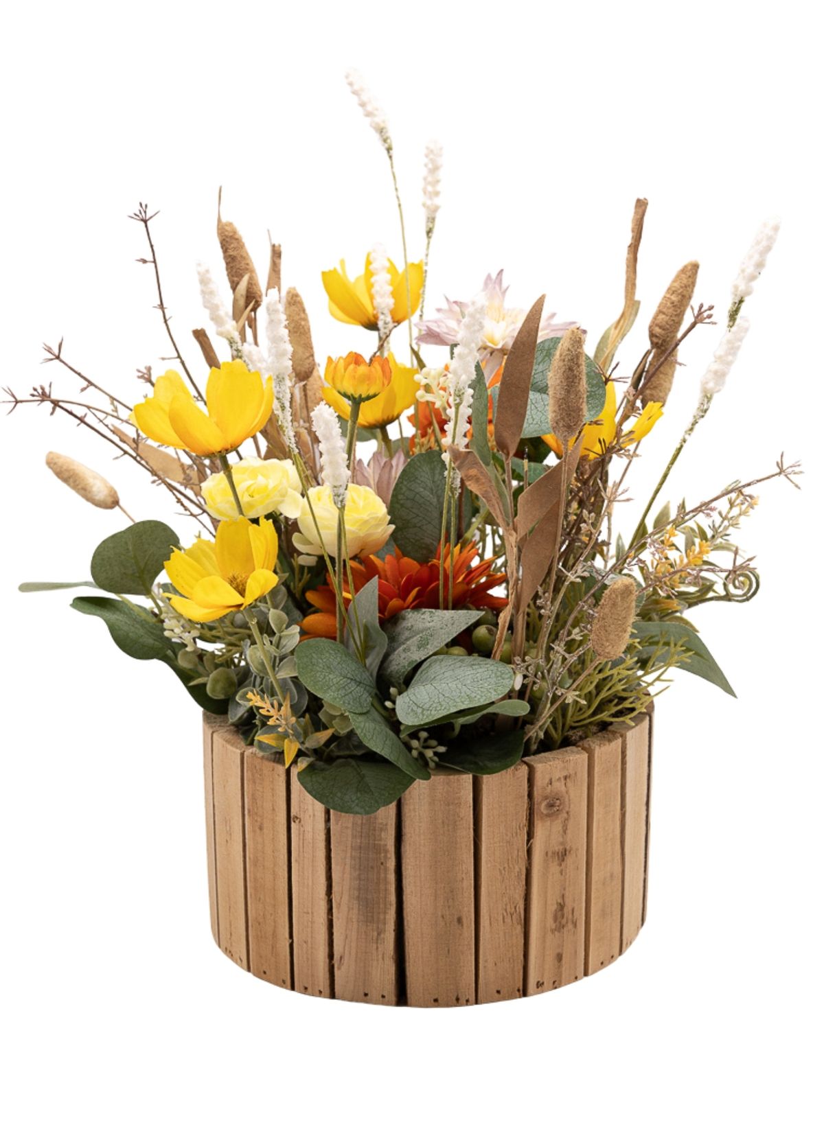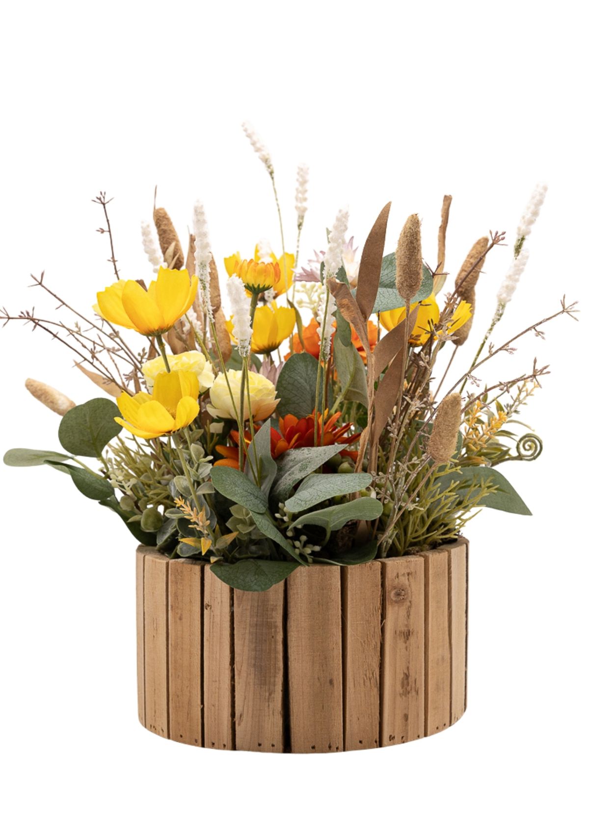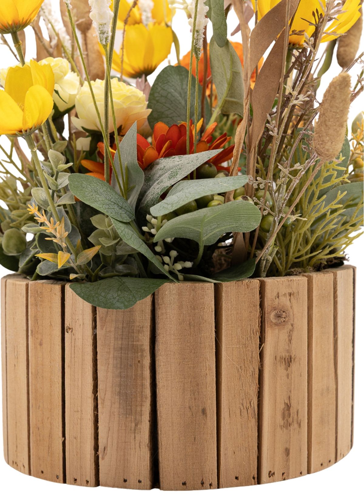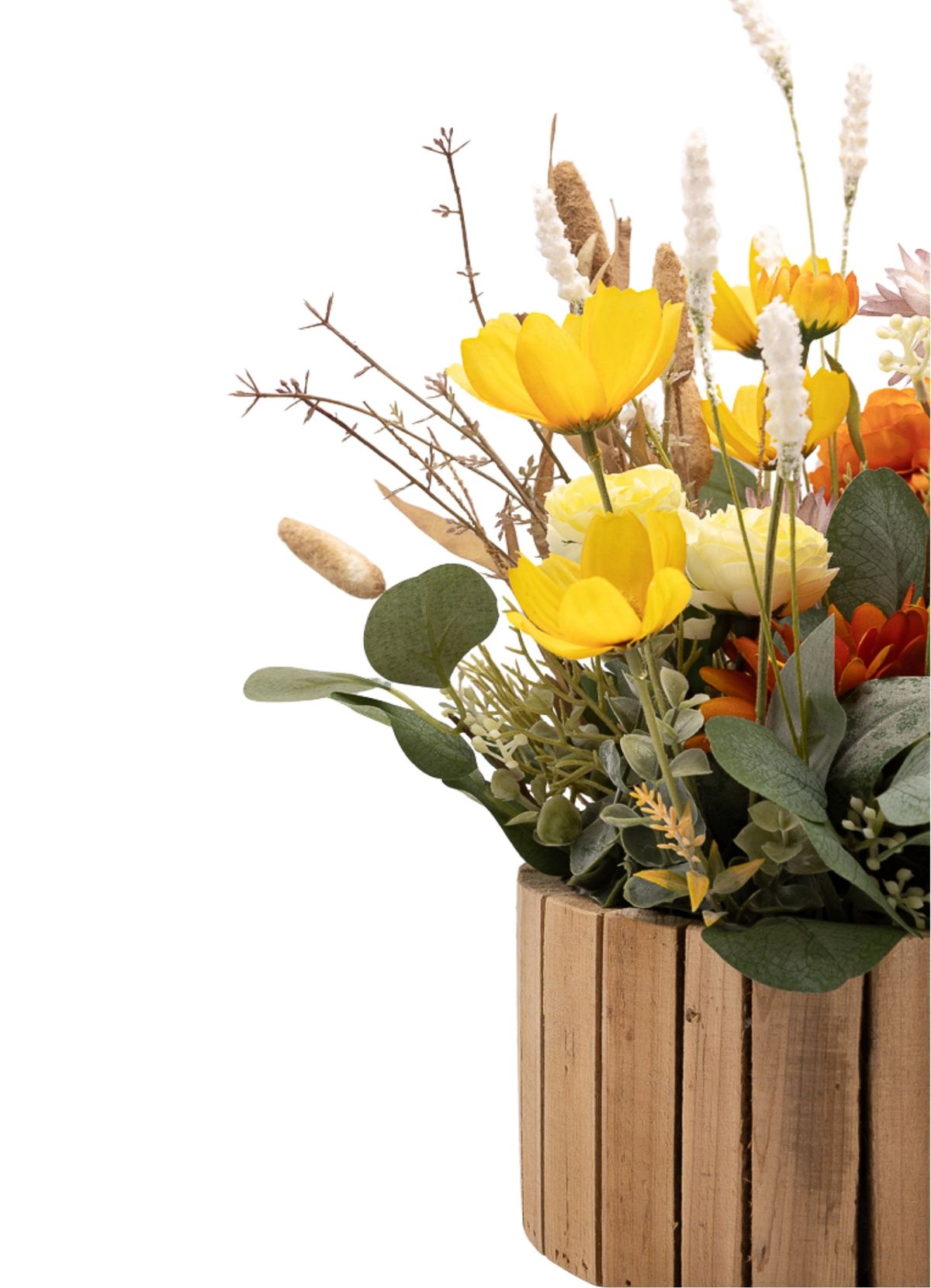 La calidez y la luz definen esta composición vibrante donde los tonos amarillos y naranjas crean un efecto alegre y lleno de vida. Las pequeñas peonías amarillas y las bidens ferulifolia aportan luminosidad y un aire fresco, mientras la peonía naranja y la gerbera refuerzan la intensidad cromática con un toque más llamativo. El lagurus en tono natural suaviza el conjunto con su textura ligera, mientras la lavanda blanca introduce un contraste delicado que equilibra la composición. El eucalipto y los verdes decorativos completan el arreglo aportando frescura y armonía. Montado sobre una base redonda de madera natural, este centro destaca por su estilo cálido y equilibrado, ideal para llenar cualquier espacio de color y energía.