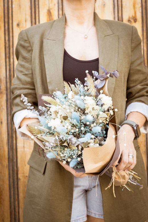 Ramo de flores secas y preservadas en color blanco y un azul nude muy bonito y delicado. Es diferente y moderno.