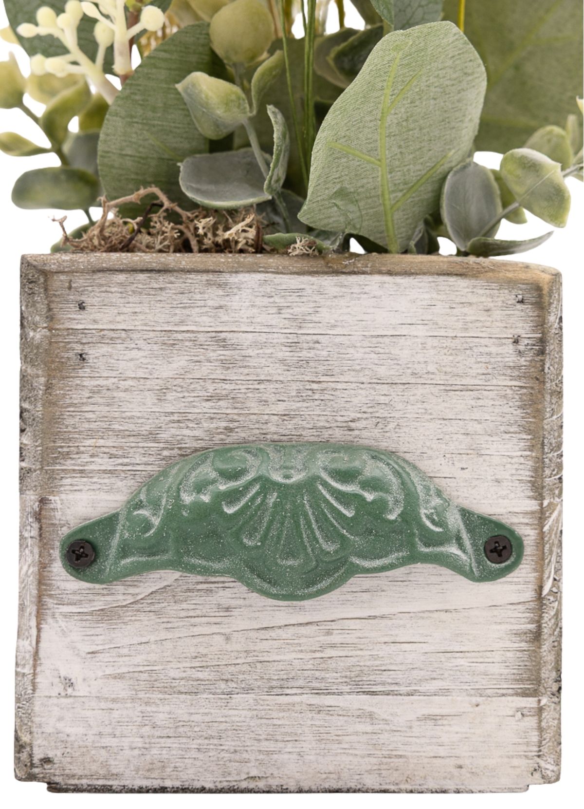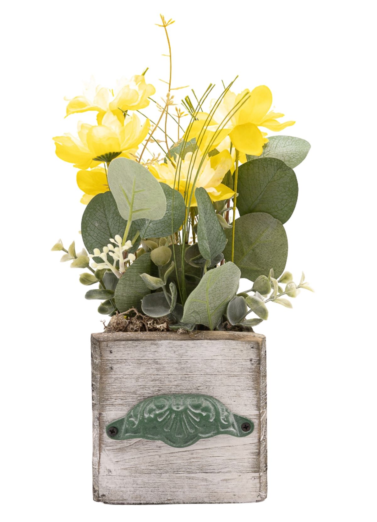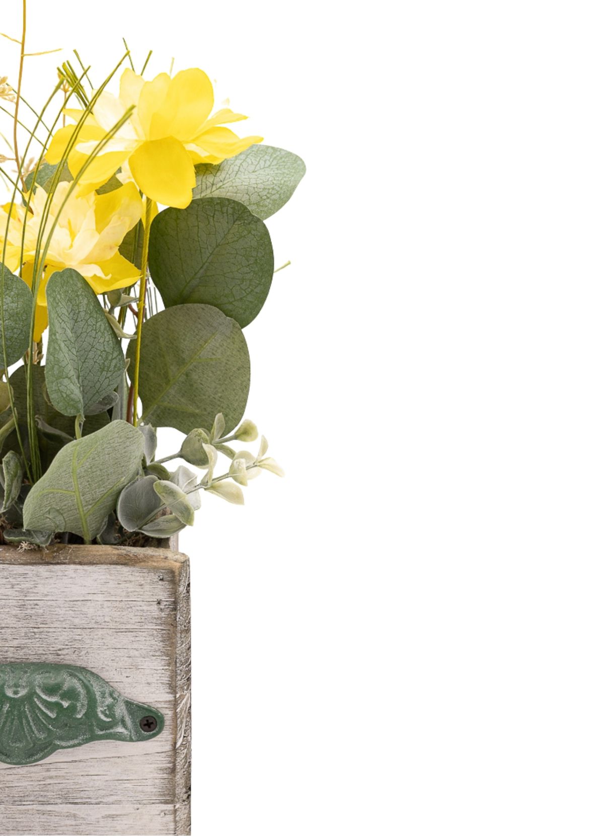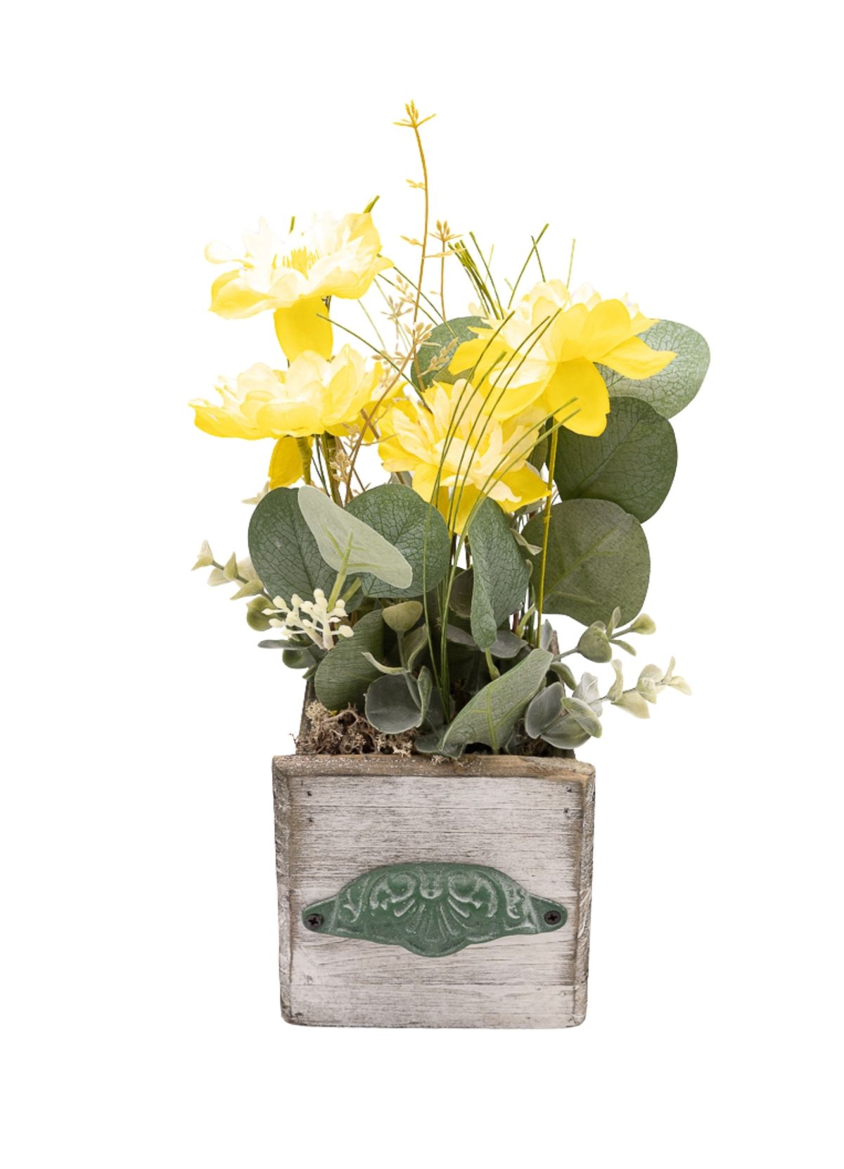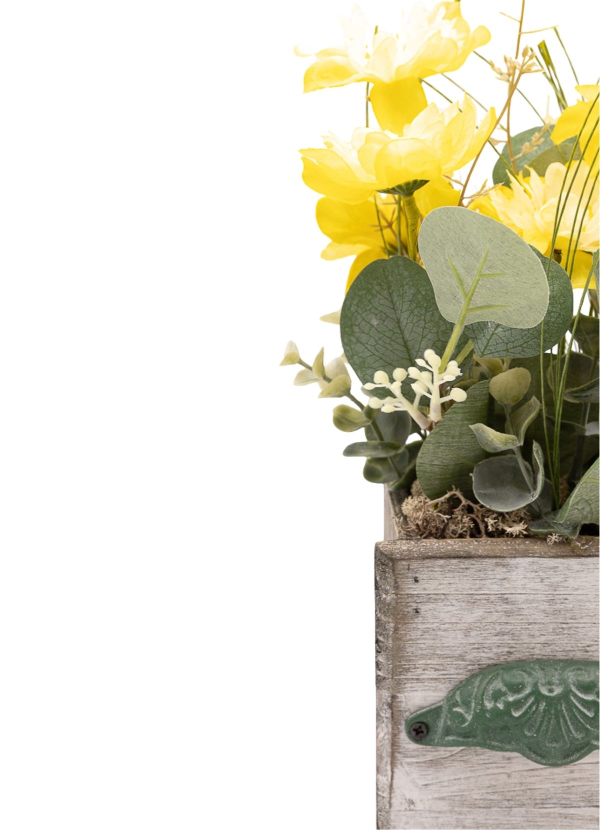 Una composición con carácter y un punto exótico donde la flor estilo rosa Banksia en color amarillo se convierte en la gran protagonista, aportando textura y un aire diferente que no pasa desapercibido. El eucalipto equilibra el conjunto con su toque fresco y natural, creando una combinación armónica entre lo llamativo y lo sereno. Montado en una caja de madera con decoración metálica en color verde, este centro destaca por su estilo singular y decorativo, perfecto para dar un toque especial y con personalidad a cualquier rincón.