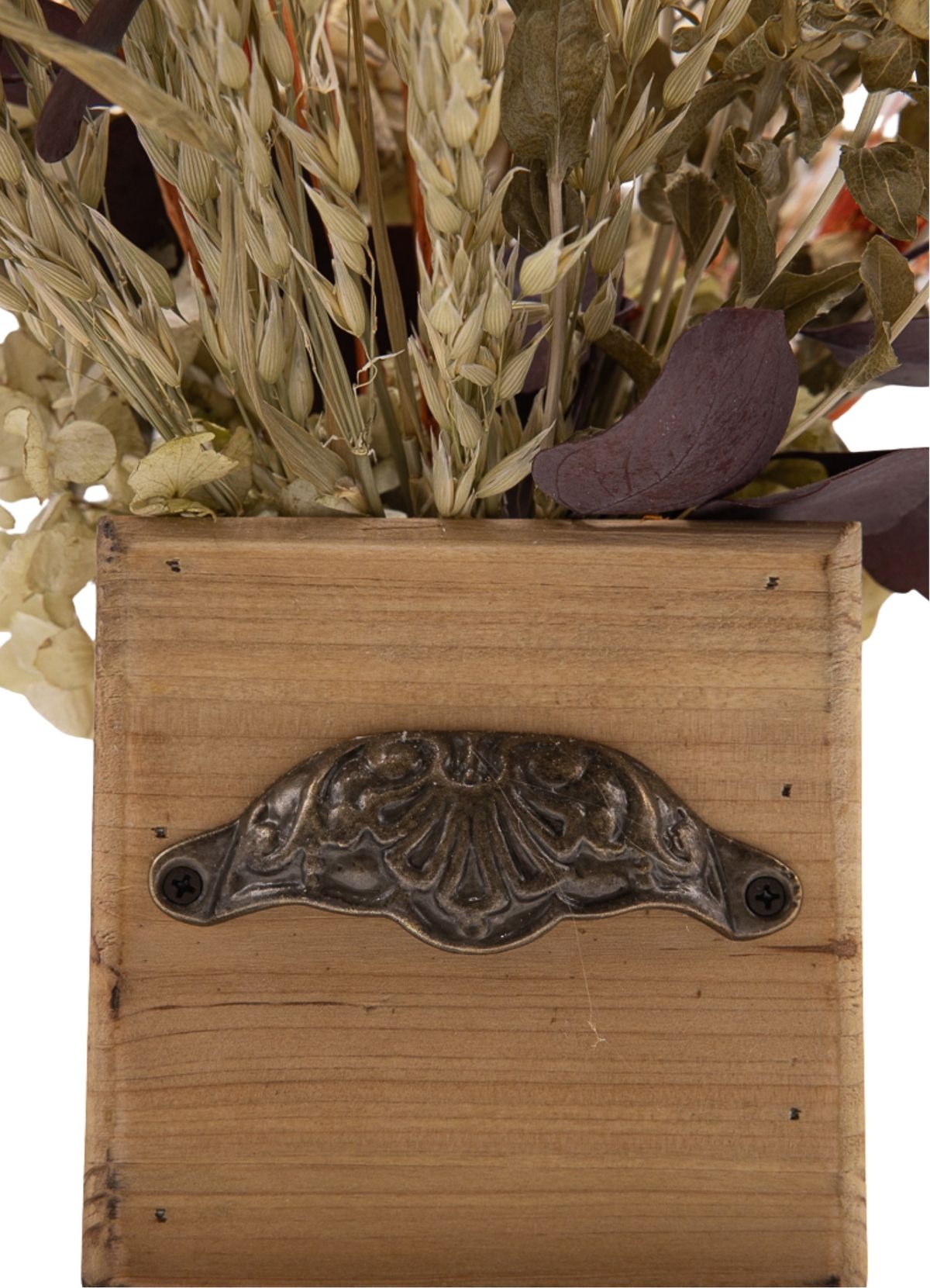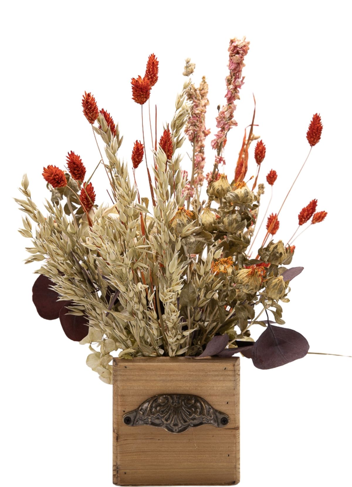 Un diseño lleno de energía y calidez donde los tonos naranjas se convierten en protagonistas absolutos. La hortensia en color natural aporta volumen y una base suave, mientras la flor de cártamo y el phalaris naranja intensifican la composición con su carácter alegre y luminoso. El delphinium en rosa introduce un contraste delicado que enriquece el conjunto, y el eucalipto morado añade un matiz inesperado que aporta profundidad y personalidad. La disposición en grupos de flor, combinada con pequeños toques de otros materiales repartidos por todo el centro, crea un efecto dinámico y muy visual. Montado sobre una base cuadrada de madera con pomo decorativo de metal, este centro es perfecto para quienes buscan una pieza con fuerza, estilo y un aire cálido que no pasa desapercibido.