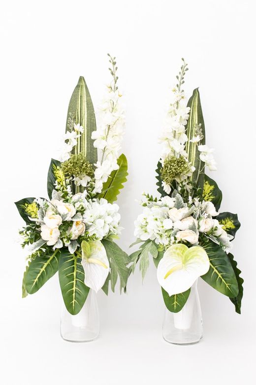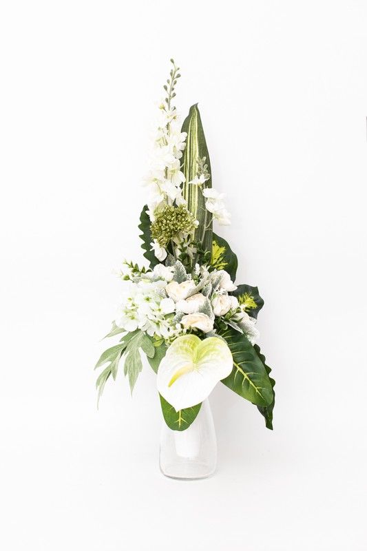 Ramo de flores para tumbas y nichos en color blanco. Este ramo de flore artificiales para cementerio lleva rosas blanco y hortensias entre otras flores. Sirve para cualquier tipo de lápida de difunto, nicho o tumba de suelo. Un ramo perfecto para recordar a tus seres queridos ya difuntos. Podrás elegir entre lateral derecho o bien lateral izquierdo.
