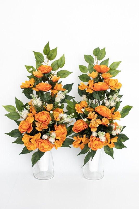 Ramo de flores artificiales para colocar en el cementerio. Lleva rosas de color naranja, margaritas y preciosos verdes. ES un diseño tradicional pero muy elegante. Es un diseño perfecto para tumbas de difuntos, nichos a cualquier altura y lápidas de difuntos. Podrás elegir entre lateral derecho y bien lateral izquierdo.