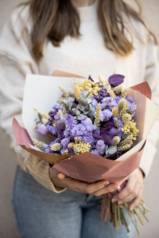 Ramo de flores secas y preservadas en colores lilas y amarillo