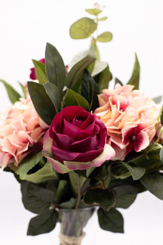 Rosas y hortensias color vino en un bonito ramos de flores artificiales