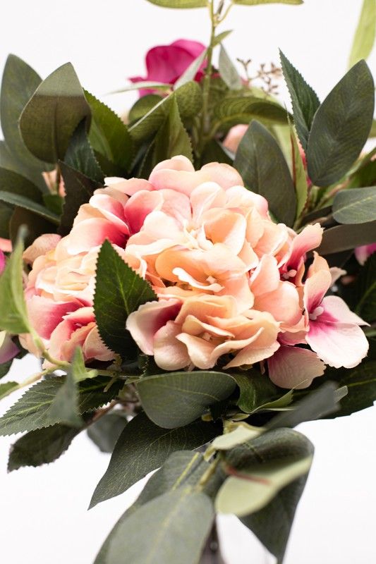 Ramo de flores artificiales en color vino, con rosas y hortensias y verdes de primavera. Ideal para regalar o para tu hogar