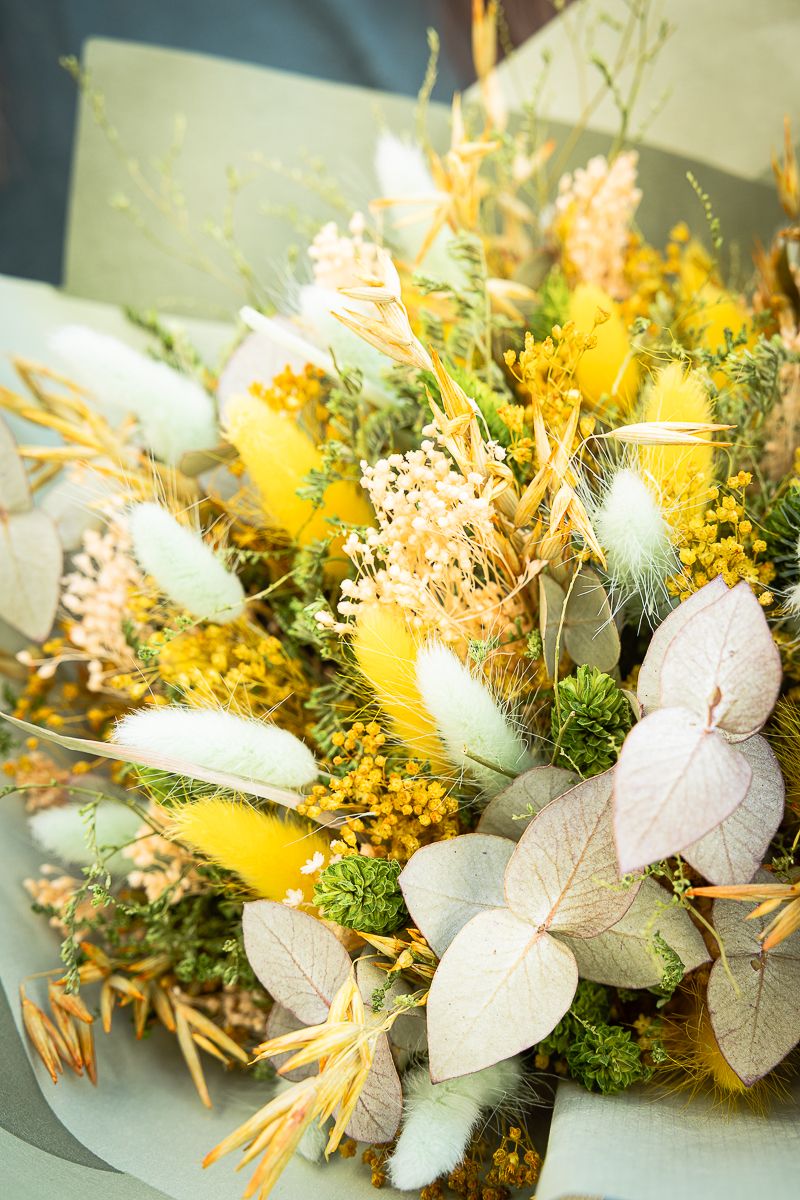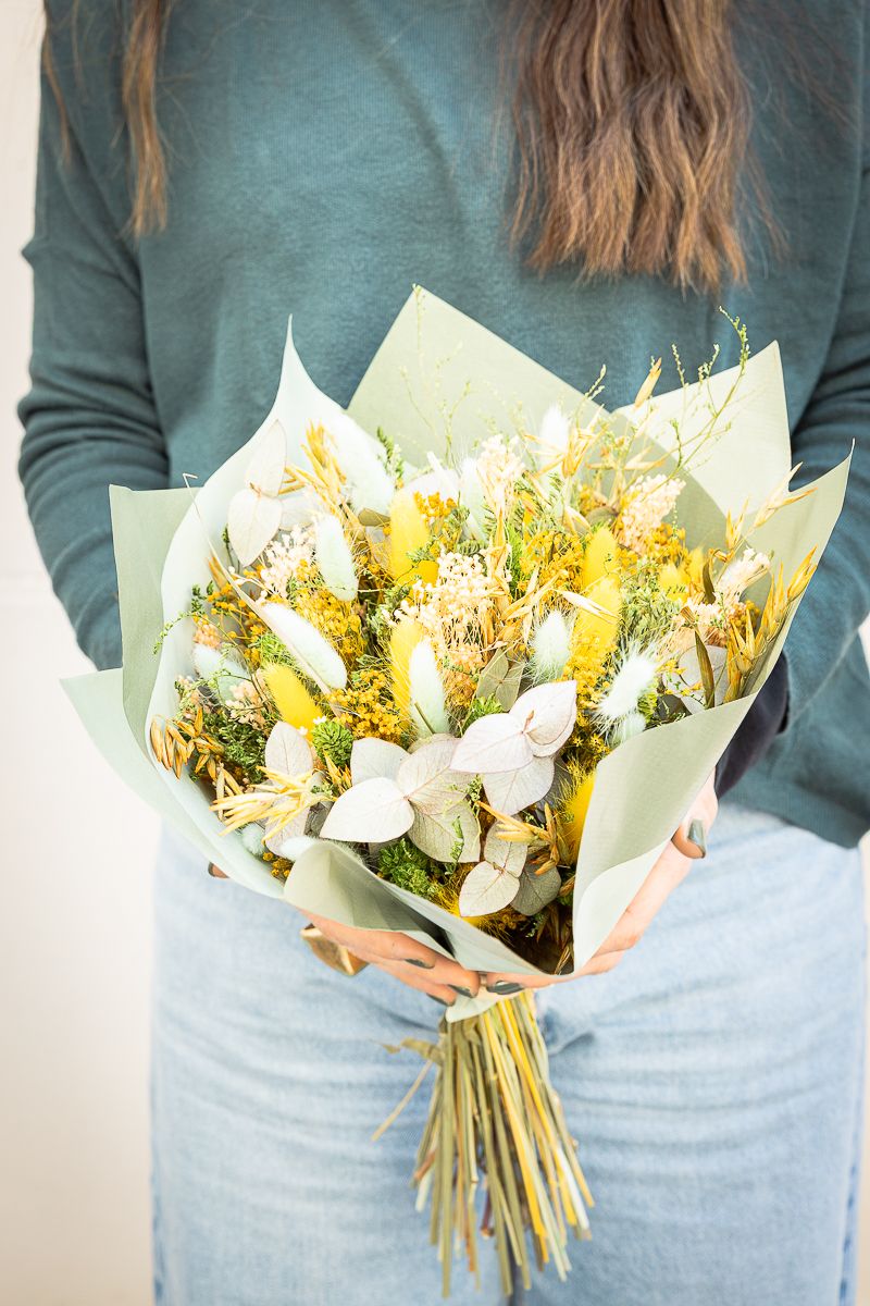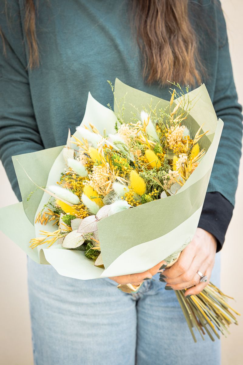Rústico ramo de flores secas y preservadas en en color verde y amarillo
