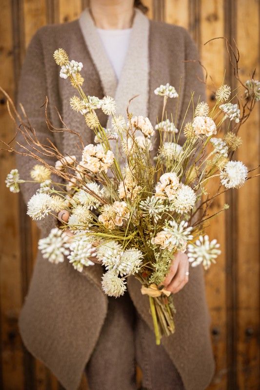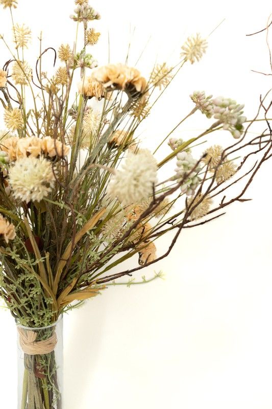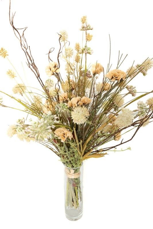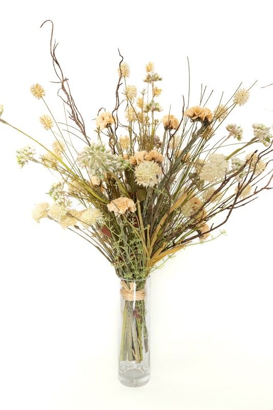 Ramo de flores artificiales con sensación rústica pero con unos colores muy suaves y delicados. Las flores artificiales utilizadas con lavandas, cosmos, y espigas. Natural, de estilo nórdico perfecto para espacios luminosos con toques clásicos. Flores artificiales de alta calidad y de alta durabilidad.