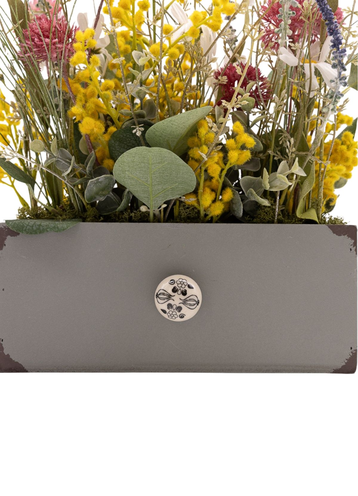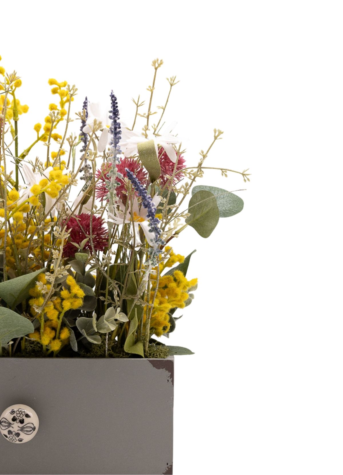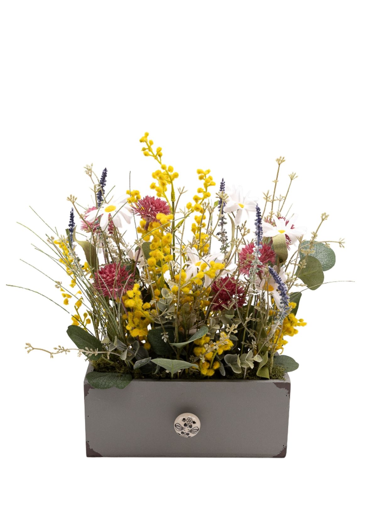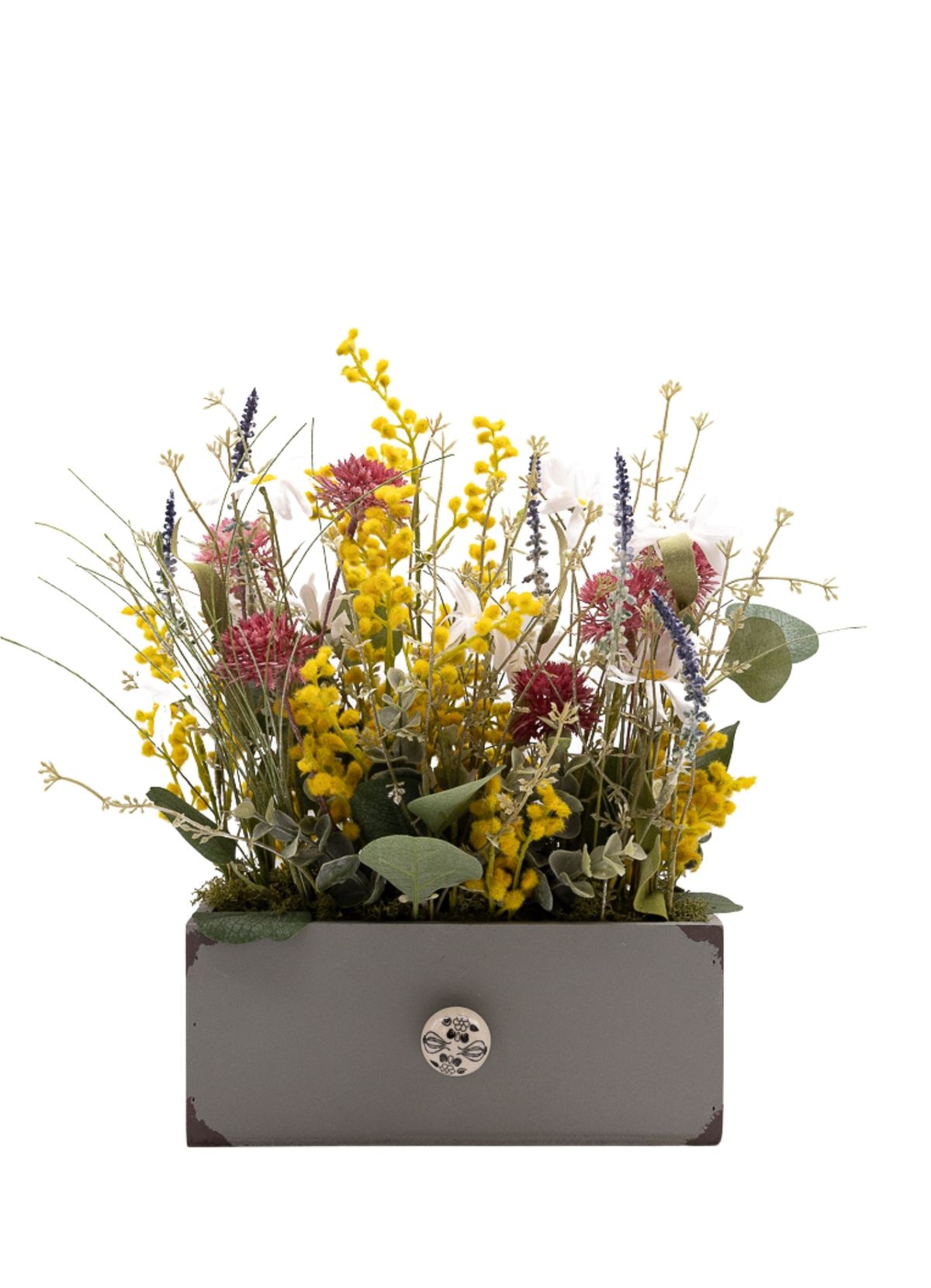 La frescura y la elegancia natural definen esta composición donde las margaritas blancas aportan luz y pureza, creando una base suave y atemporal. La mimosa añade un toque delicado y ligero, mientras la flor estilo cotinus en color morado introduce contraste y profundidad con un aire más sofisticado. La lavanda y la salvia refuerzan el carácter aromático visual del conjunto, aportando textura y un matiz campestre muy equilibrado. El eucalipto y los verdes decorativos completan la composición, unificando los elementos con frescura y armonía. Montado sobre una base de madera rectangular en color gris con un pomo decorativo de piedra, este centro destaca por su estilo elegante y natural, perfecto para aportar serenidad y personalidad a cualquier espacio.
